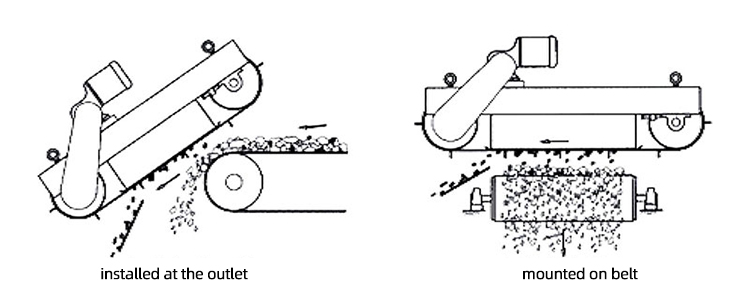 When the crushed material conveyed by the belt conveyor passes through the iron remover installed on the tail bracket, the iron and other magnetic materials in the material are attracted, and the iron and other magnetic materials are transported by the conveyor belt to the electric drum and fall to achieve the purpose of automatic iron removal .
